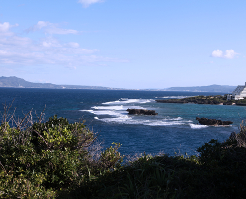 만좌모 해안의 일부분은 융기한 산호가 날카로운 모양으로 굳어진 곳으로 독특한 지형을 이루고 있는데, 수평선 너머 북쪽으로는 오키나와의 북부(모토부) 지역이 보이고, 아름다운 해안선을 따라 고급 리조트가 늘어서 있는 곳입니다. 절벽 위에는 넓은 잔디밭이 펼쳐져 있는데, 18세기 류큐왕국의 쇼케이왕이 이 들판을 보고 ‘만 명이 앉아도 충분한 들판’이라고 감탄한 데서 ‘만좌모’라는 이름이 유래하였다고 합니다. 58번 해안 도로를 따라 즐비하게 늘어선 리조트에서는 다양한 해양 스포츠를 즐길 수 있습니다