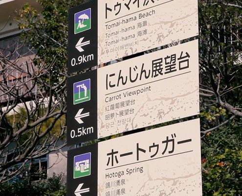 츠켄 항에 도착 하여 육지 쪽으로 약 200미터 정도 가시면 마을 안내 표지가 나오는데 이 표지를 중심으로 오른쪽은 자전거 대여점과 식당 등이 많은 곳이라고 보시면 되구요, 왼쪽 편으로 가시면 당근 전망대, 토마이 해변, 당근 농장 등이 있는 섬의 볼거리가 있는 방향이라고 보시면 됩니다 (일단 자전거 대여도 해야 하니 오른쪽으로 먼저 둘러 보세요)